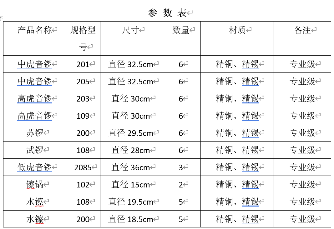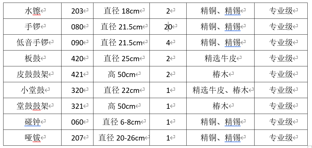 B京剧乐器数量及技术参数如下图: