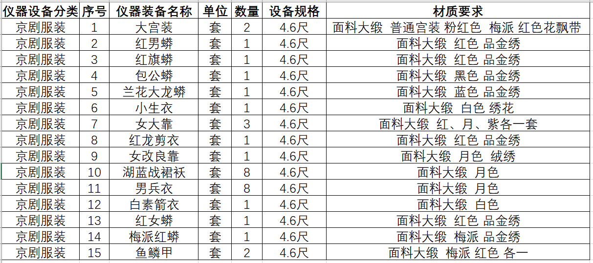 本项目共设两个包,A京剧服装;B京剧乐器;